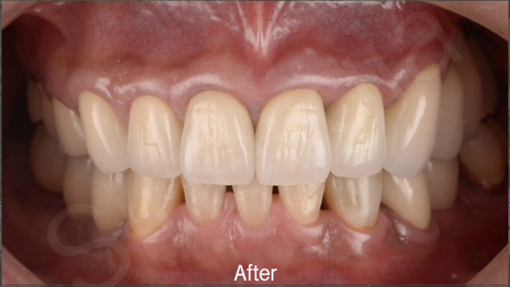 治療方法:歯周基本治療後、歯肉縁下う蝕により生物学的幅径が侵襲されている歯に対しては矯正的挺出および臨床歯冠長延長術を行なった。欠損部に対してはインプラント埋入を行なった。その際必要部位に対してはGBRを併用している。一連の補綴前処置終了後、インプラントに対してはアバットメントおよび上部構造を、歯に対しては補綴装置を装着し、補綴処置により咬合回復を行った。